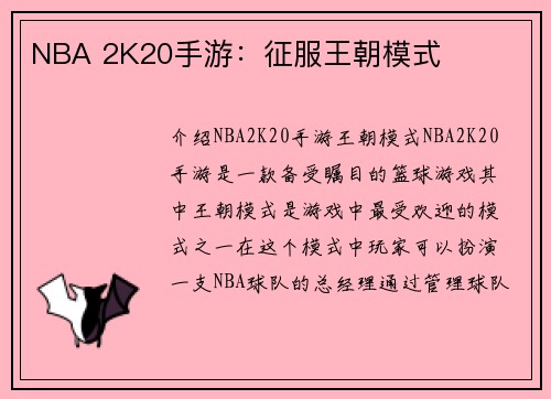 NBA 2K20手游王朝模式是一款非常有趣和具有挑战性的游戏模式。通过合理的球队建设、球员管理、战术运用、球队化学反应、比赛管理和球队发展,玩家可以建立一个强大的球队,并取得辉煌的成就。希望本文的介绍能够帮助玩家在NBA 2K20手游王朝模式中取得成功。