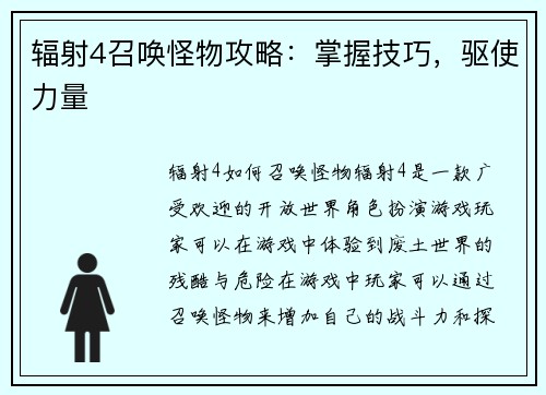 辐射4中的召唤怪物是一项强大而有趣的功能。玩家可以通过寻找召唤法术、学习召唤技能、收集召唤材料和提升召唤技能等级来召唤怪物。制定合理的召唤战略、管理召唤怪物和与它们合作也是成功召唤怪物的关键。通过善用召唤怪物的能力,玩家可以在废土世界中取得更大的战斗和探索成果。