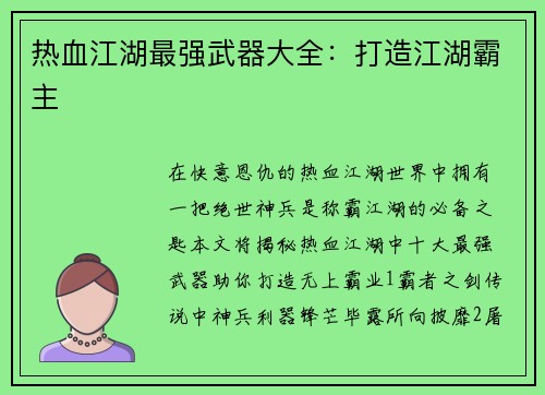 在快意恩仇的《热血江湖》世界中,拥有一把绝世神兵是称霸江湖的必备之匙。本文将揭秘热血江湖中十大最强武器,助你打造无上霸业!